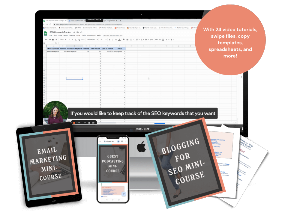This mini-course bundle gives you everything you need to create an ecosystem of optimized content that helps your clients find you, gets them excited to join your email list — with a welcome series that grows their trust in you — and has them scheduling that call to work with you. And it’s far easier (and let’s just say it: less embarrassing) AND more effective than recording that 30 second reel that takes you 1/2 a day to produce!